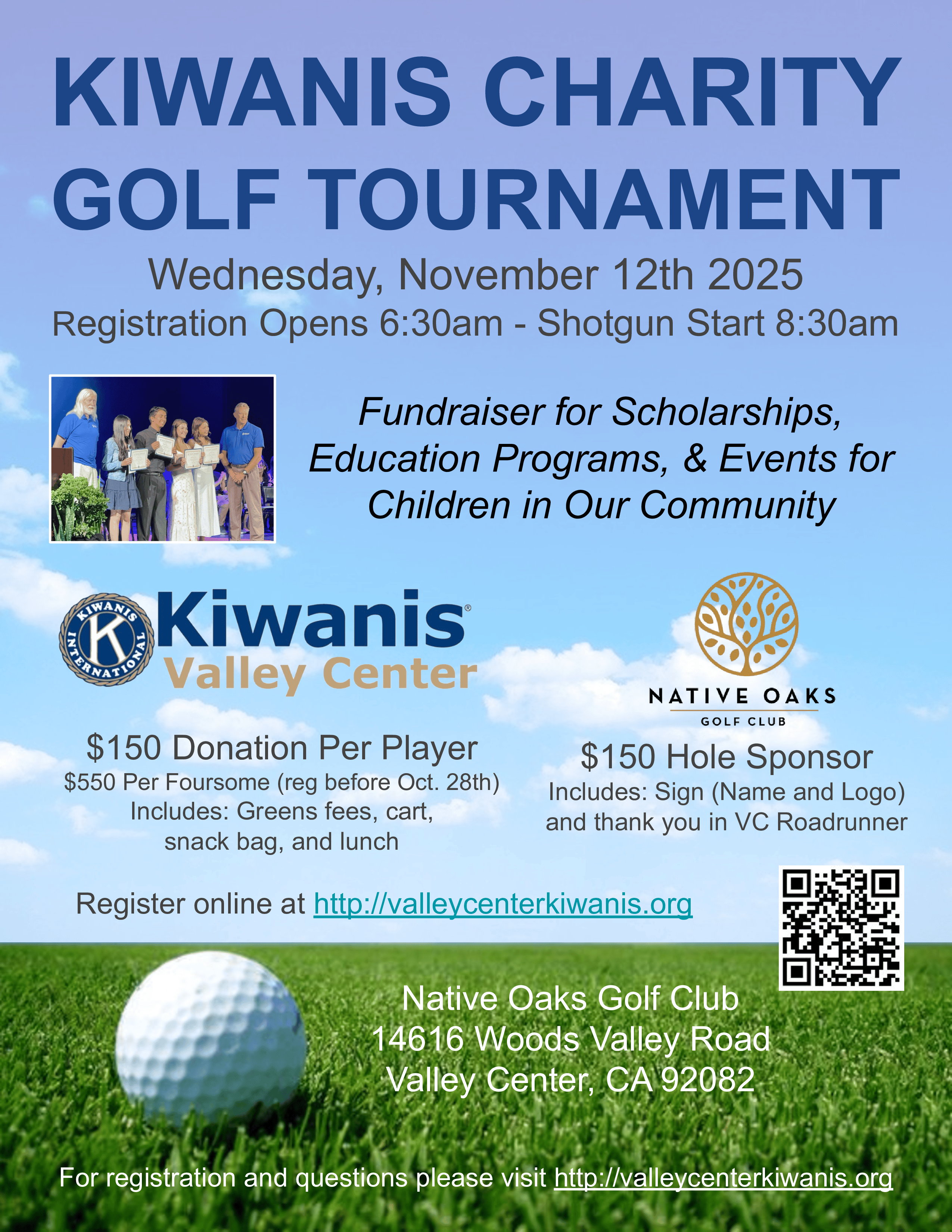 The Valley Center Kiwanis Golf Tournament 2025 at Native Oaks Golf Club invites players and sponsors to enjoy a great day of golf while supporting scholarships and youth programs that make a difference in the Valley Center community.